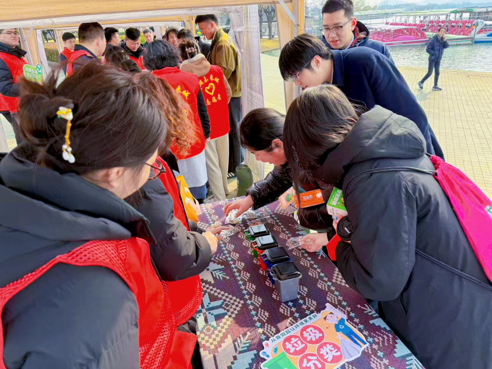活动现场,青年们身穿志愿服务的“红马甲”,开展公益市集、环保宣传、生态巡检,特别设置了“绿色闯关挑战”“生态盲盒抽奖”“有奖知识竞答”等互动项目,带给市民游客沉浸式的科普体验。蠡湖景区充分发挥场地优势,为活动提供特色生态景观资源支持,景区的十余名党、团员志愿者结合环保热点,开展了特色垃圾分类有奖互动志愿宣传活动,以别开生面的垃圾投放小游戏,向市民游客宣传生态文明思想、践行绿色发展理念。