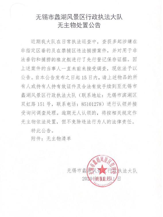 无锡市蠡湖风景区行政执法大队无主物处置公告