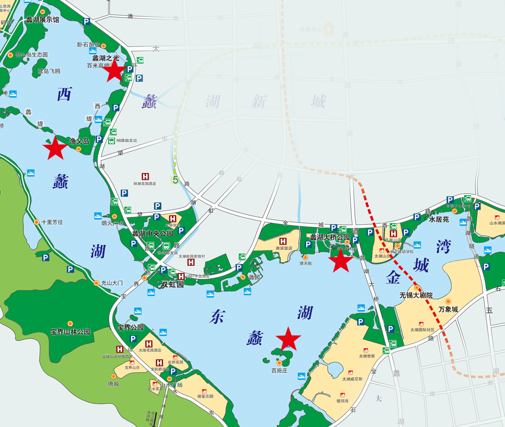 蠡湖大桥公园游船码头、百米高喷游船码头、渔父岛游船码头、西施庄游船码头(标记五角星处)